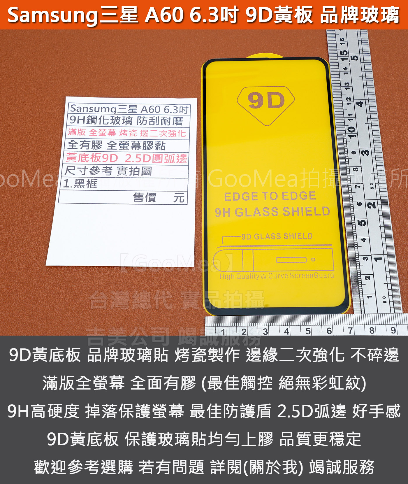 GooMea 4免運Samsung三星 A60 6.3吋 9H鋼化玻璃貼 烤瓷二強 全有膠 全螢幕膠黏 黃底板9D
